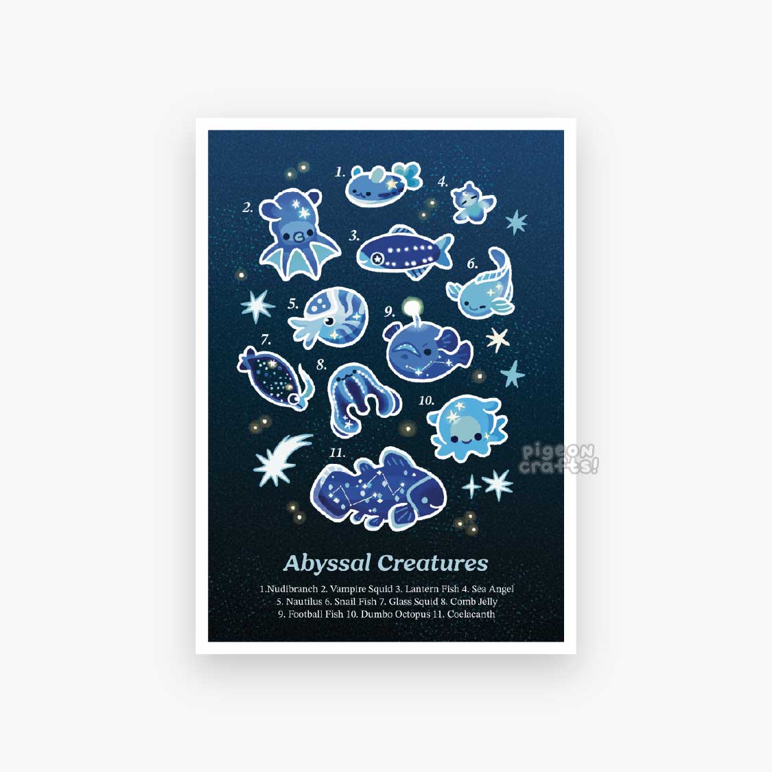 Designed like a vintage science poster, this print features our fave deep sea animals in midnight blue + white, inspired by bioluminescence in the deep.