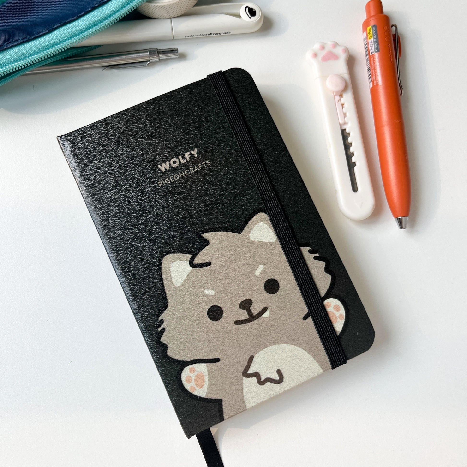 A classic lined hardcover notebook, featuring Wolfy!