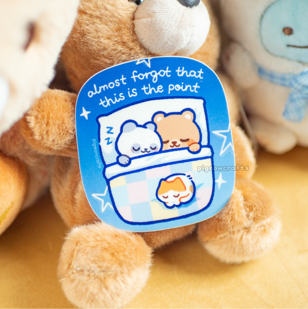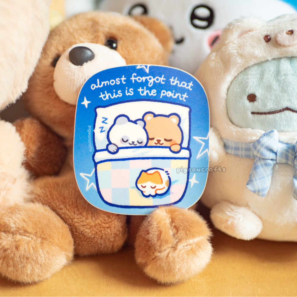 A sticker wrapped in nighttime coziness✨ This twilight version features two animals cuddling in bed under a soft, dreamy sky.